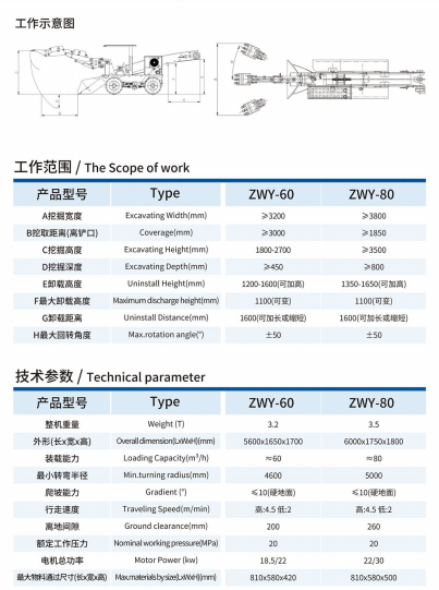 ZWY-60/80 輪式輸送帶挖掘式裝載機是一種連續生產的高效率出礦設備。主要用於空間狹窄的 洞采作業,如金屬礦,非金屬礦,引水巷道等。